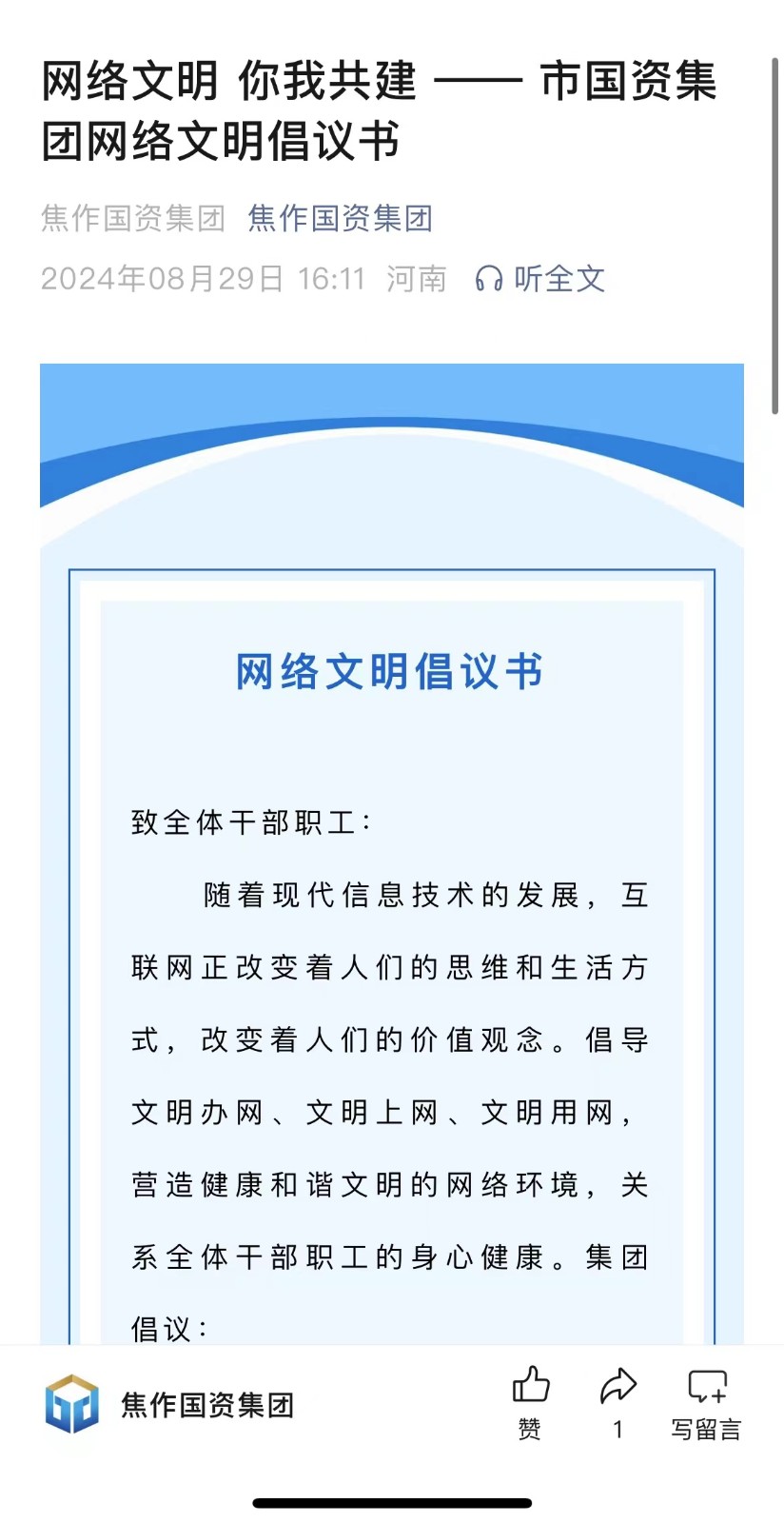 8月29日,市伟德体育集团发起网络文明倡议书,充分利用集团网站、微信公众号、公示栏,成立网络文明传播志愿小组,出台网络文明管理制度,坚持文明办网、文明上网,引导干部职工承担伟德国际1946,始终把国家和公众利益放在首位。
